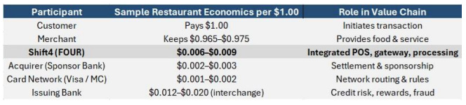 Shift4 is uniquely positioned relative to most payments companies because it owns the gateway layer, allowing it to sit structurally between the merchant and the acquirer. This control enables Shift4 to embed payments directly into mission-critical POS and commerce software, retain a larger share of transaction economics, and flex pricing without relying on third-party processors, rather than competing as a standalone, price-taker processor.