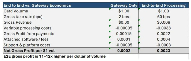 Shift4’s one-stop-shop offering and vertical focus highlight the underlying strength of its business model. Historically, many payments and commerce software companies, including Toast (TOST), Block (XYZ), Lightspeed (LSPD), and NCR Voyix (VYX), have led with hardware and feature-rich POS systems, building sticky customer bases and recurring software revenue while treating payments as a secondary concern and outsourcing transaction processing to third-party providers. This approach reflects the long-held view that payment routing alone adds little value, as gateway-only models are commoditized, low-margin, and easily replaced. I don’t disagree. But by owning the economics of transaction capture and settlement, Shift4 can retain a spread and generate meaningful gross profit, rather than earning the residual economics associated with simple transaction routing.